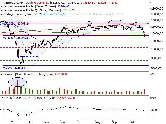 Het handelsvolume zorgt voor een andere domper, want behalve de daling in september werden gisteren de hoogste verkopen van de afgelopen maanden genoteerd. De volumeontwikkeling ondersteunt daarmee de noodlijdende marktsituatie. Hoewel de DAX vanochtend een stabilisatietendens vertoont, is en blijft een basisvereiste voor een duurzame opheldering van de kaartperspectieven een herovering van de “dubbele gemiddelden” op 12.239 / 12.116 punten.