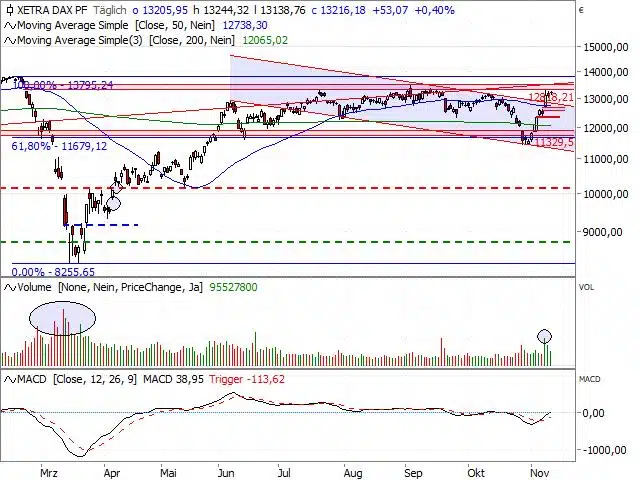 Desalniettemin is de bottom line een verdere opmars op basis van de slotkoers. Dankzij deze ontwikkeling bevestigt de DAX het uitbreken van de correctievlag die sinds de high begin september op 13.460 punten bestond (zie grafiek). Dit trendbevestigende koerspatroon geeft de stieren een belangrijk wapen.