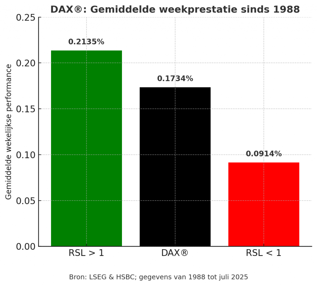 We hebben een simpele strategie getest op de historische data van de DAX: investeer in de index als de RSL-waarde van de voorgaande week groter was dan 1. De resultaten documenteren de effectiviteit van deze aanpak op spectaculaire wijze.