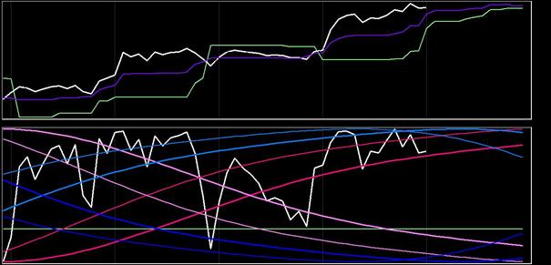 De mintgroene lijn onderscheidt strategische koopwaardige fases (grafiek onder mintgroen) van verkoopwaardige periodes (grafiek boven mintgroen). De paarse lijn levert een extra tactische tradingindicatie: de grafiek onder paars is koopwaardig, boven paars is verkoopwaardig.