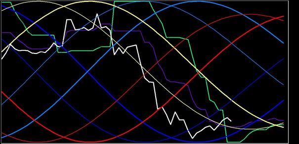 De rood/gele cycli vormen een bearish (aankoopwaardige) formatie. De formatie van de donkerblauwe/lichtblauwe is echter nog bullish (verkoopwaardig). De donkerblauwe cycli zorgen wel voor bodemvorming. De nabije gele cyclus en de naderende lichtblauwe leveren een eensgezind aankoopsignaal. Kortom: de DAX is (mits onder de mintgroene lijn) koopwaardig. Kortom: alert zijn op het benutten van koopkansen.
