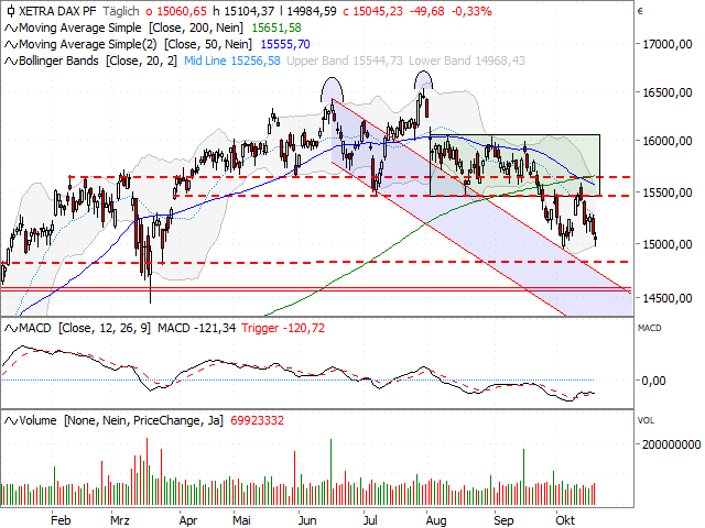 Het overkoepelende beeld van DAX blijft beschadigd zolang de Duitse standaardwaarden onder de voormalige sleutelzone uit diverse horizontale markeringen (15.500/15.600 punten) en de gladde lijnen van de laatste 50 respectievelijk 200 dagen (momenteel op 15.556/15.652 punten) noteren.