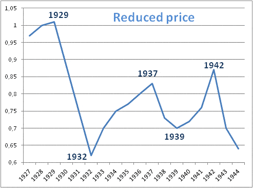 Twee maanden geleden schreef ik een column getiteld “Dit is 1937 op herhaling”. In dit artikel legde ik een verband tussen de prijsstijging vanuit de vortex-bodem van 1932 naar de ‘deflationary growth peak’ (DG-peak) van 1937. Met prijsstijging doel ik op de ‘reduced price’, dit is het Amerikaanse prijsniveau gecorrigeerd voor de groei van geldhoeveelheid M3 en de begrotingstekorten van de Amerikaanse overheid, zoals ontwikkeld en uitgewerkt door Michael A. Alexander in zijn boek “The Kondratiev Cycle”. Zie hier de grafiek van de reduced price van 1927-1944: