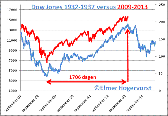 De top van 1937 is zoals gezegd de DG-peak. Toch maken we in 1942 een hogere top. Volgens Alexander zouden we deze top waarschijnlijk niet gemaakt hebben ‘in absence of World War II’. Hoe dan ook, de Dow Jones bodemde en topte eveneens in respectievelijk 1932 en 1937. De parallel met de vortex van 2009 en de bodem van de Dow Jones in dat jaar was snel getrokken. Zie hier een update van de grafiek waarin 1706 dagen beursstijging van 1932-1937 naast die van 2009-2013 worden gezet: