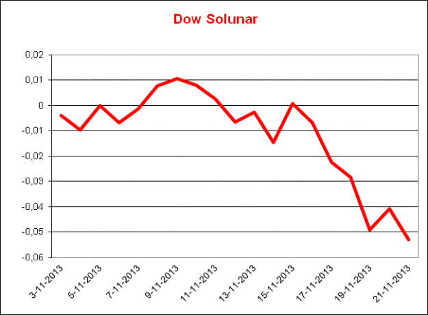 We zien in dit model de Dow Jones een top maken op zaterdag 9 november om daarna tot 21 november een snoekduik omlaag te maken. Kortom, de vergelijking met 1937, de tides en het Solunarmodel zeggen dat een belangrijke top in de buurt is, misschien al geweest is of rond het weekend van 9-10 november komt, ofwel op vrijdag 8 november of maandag 11 november. We gaan het afwachten.