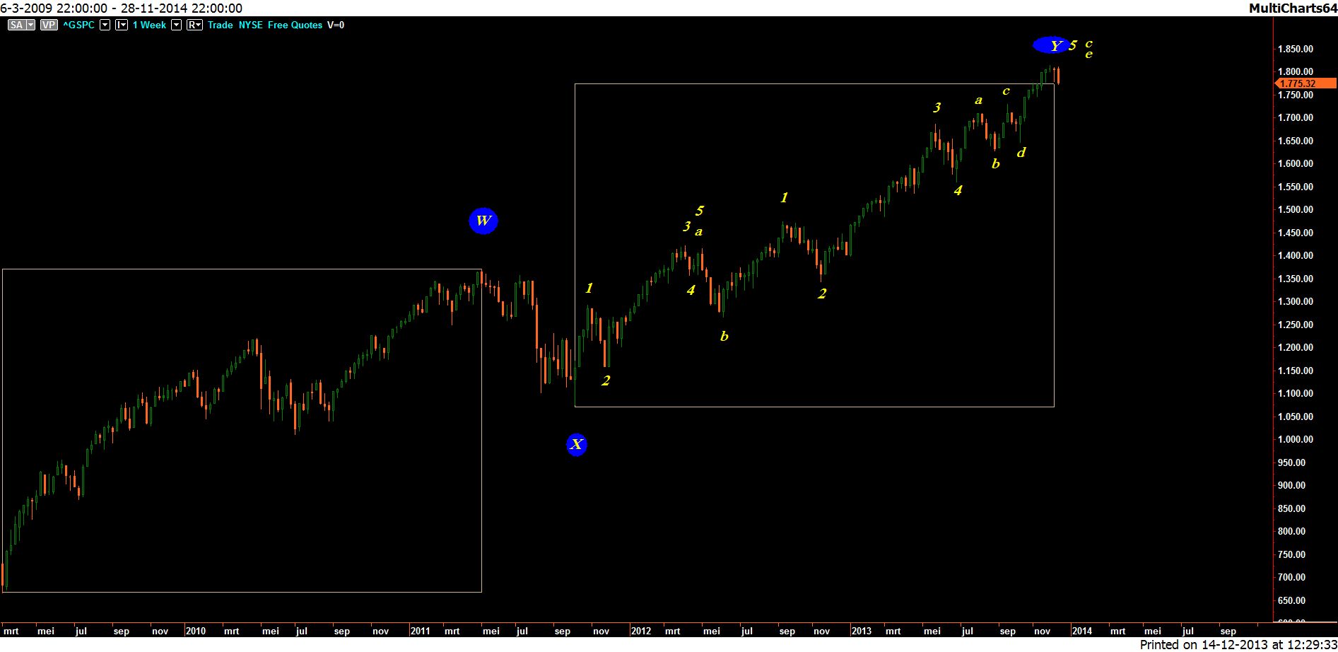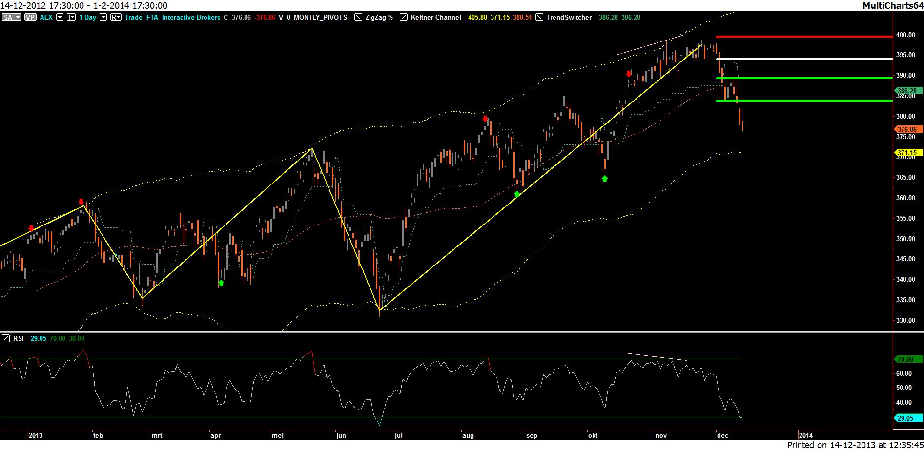 Het lastige is natuurlijk dat als de VS toch (tijdelijk?) steun vinden op deze 1775, de AEX in ieder geval een mooie bounce te wachten staat. Maar in deze twijfelgevallen is het altijd raadzaam naar het grotere plaatje te kijken en zult u rekening moeten houden met de grote risico’s die gepaard gaan met long- posities na de 1e week van december 2013.