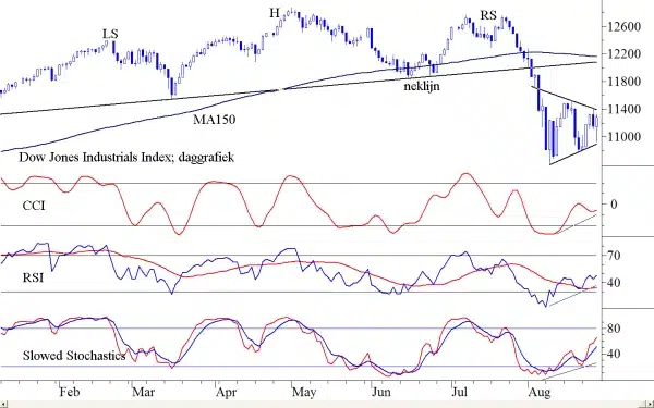 Het dubbele bodempatroon is in de afgelopen week geëvolueerd tot een gelijkbenige driehoek. Het ziet er nu naar uit dat deze driehoek het keerpunt gaat worden. Om bij het begin te beginnen wijzen wij u op de Kop en Schouderformatie die zich sinds maart gevormd heeft. Op 2 augustus volgde de uitbraak. Er kon toen een doel worden berekend van 10.800. Vijf dagen later werd dit doel bereikt. De beurs sloot toen op 10.605. Daarna geraakte de beurs in een consolidatiepatroon.
