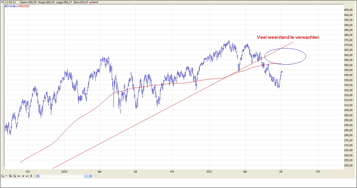Rond 350 punten in de AEX is er weerstand te verwachten van de MA 200 en op globaal 368 komen we de voormalige steunlijn, deze lijn kan nu voor weerstand zorgen Een redelijk troosteloos beeld. 2011 lijkt voor de AEX dan ook een verloren jaar te worden is mijn conclusie. Een daling in andere markten zal dan voor de AEX extra nadelig kunnen uitpakken gezien het verzwakte beeld voor de middellange termijn.