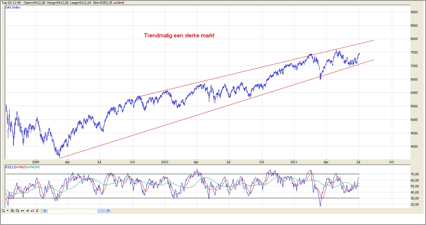 De afgelopen maanden is de Duitse DAX een van de sterkste indices gebleken. Ook de afgelopen dagen wist deze index sterk te presteren. In tegenstelling tot de S&P 500 vind ik de bewegingen van de DAX in een aantal opzichten onduidelijk. De recente daling heeft ongeveer 50 % van de voorgaande stijging gecorrigeerd. De stijging sinds de bodem is nu aangekomen op het 74,6 correctie nivo rond 7460, in de meeste gevallen is dit het maximum. Er zal dus een keuze gemaakt moeten worden. Zetten we weer een daling in, of zet de stijging door? We zullen het af moeten wachten. Op basis van de S&P 500 verwacht ik dat een eventuele stijging een beperkt potentieel zal hebben.