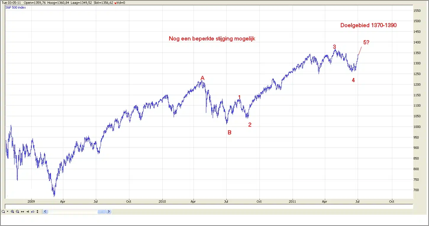 In mijn artikel van 17 juni ging ik voor de S&P 500 uit van een daling tot ongeveer 1250 nadat er een herstel tot ongeveer 1300 was geweest. Dat herstel is er gekomen maar de daling bleef bij 1266 steken, zeg maar een dubbele bodem. Vervolgens ontwikkelde er zich een krachtige stijging. Omdat deze stijging redelijk krachtig is en omdat de lange trend in de S&P 500 nog niet is gebroken bestaat er de mogelijkheid dat het proces van topvorming meer tijd gaat vergen. Komt daarmee de visie voor de lange termijn in gevaar? Ik denk het niet, vooralsnog blijft mijn visie voor de middellange termijn negatief.