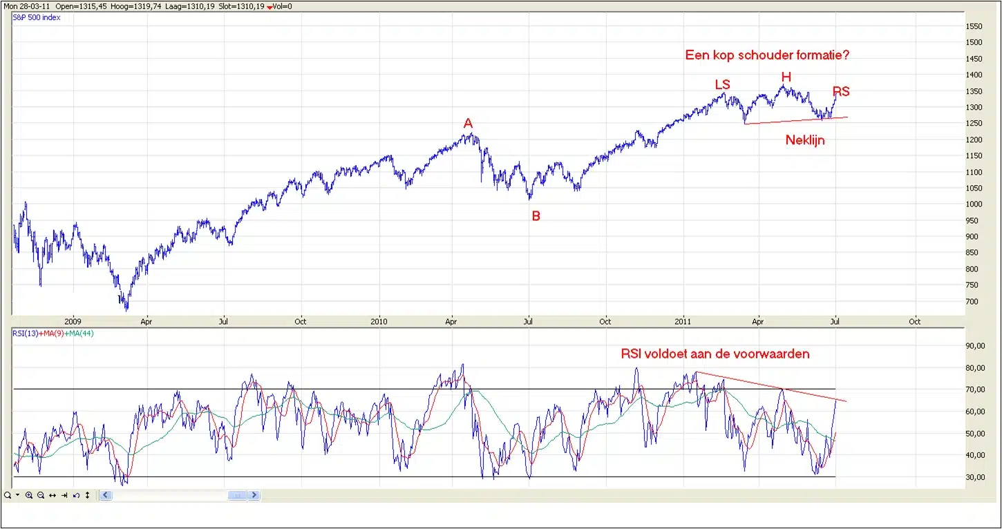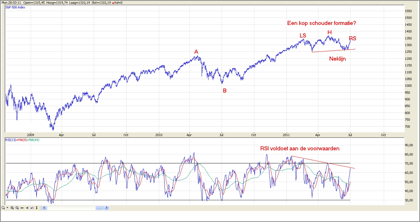 In het geval de top in mei is gezet op 1370, dan hebben we nu te maken met een herstel op deze daling. Op basis van de RSI is het mogelijk dat de huidige stijging onderdeel is van een rechter schouder van een kop schouder formatie. Ik moet toegeven dat een dergelijk patroon pas waarde krijgt indien de S&P 500 onder 1255 zakt maar het is in ieder geval iets om alert op te zijn.