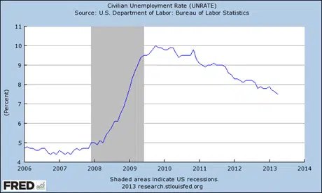 Vanaf het hoogste punt in april 2010 (9,9%) is het werkloosheidspercentage elke 12 maanden met 0,8 punten teruggelopen tot 7,5% nu (zie grafiek). Dat zou betekenen dat het in het huidige tempo