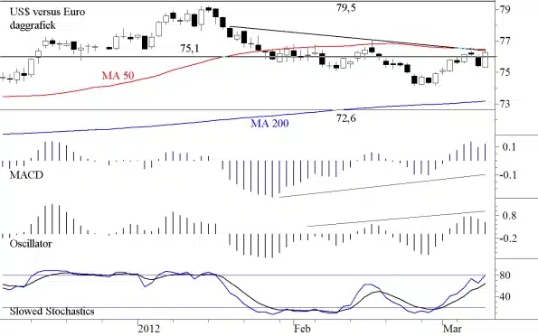 Inderdaad ziet het ernaar uit de dollar zijn correctiefase heeft afgesloten. Een bevestiging van deze hypothese zal verkregen worden als de dollar 76,3 of hoger noteert (of zo u wilt de grens van 1,31 in neerwaartse richting wordt doorbroken). Wij hebben in de figuur hieronder een dollargrafiek opgenomen op dagbasis.