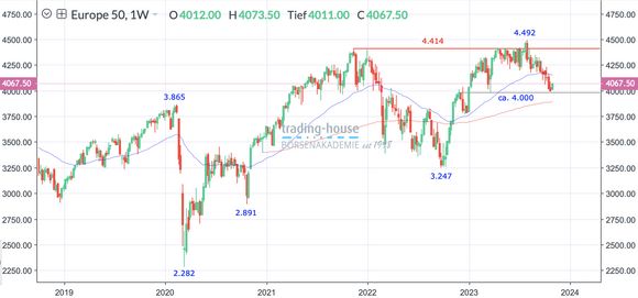 Als de EuroStoxx 50 onder de 3.988 punten van vorige week daalt, dan zijn de volgende doelen de EMA 200 en 3.857 punten.