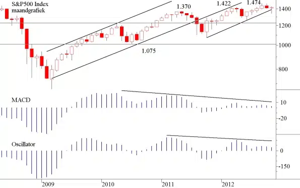 Na negen witte candles werd door de AEX de bovenkant van een dalend kanaal bereikt en de koers kwam intraday net op een hoger punt dan de voorgaande top 339,46 versus 339,43). Maar de top uit september (340,22) werd niet gebroken. Alles pleit ervoor dat dit binnenkort echter wel zal gebeuren. De explosie van de afgelopen weken vereist een correctie en die werd vrijdag dan ingezet. Op 331 ligt de steun die uitgaat van het 50-daags voortschrijdend gemiddelde en op 325 ligt de steun van een eerder gezette bodem. Wij verwachten niet dat de correctie veel verder zal gaan, want de hogere timeframes zijn duidelijk positief. Alleen Amerika geeft een sterk afwijkend beeld van de langere termijn. De vraag blijft of Amerika de markten in Europa dan toch eindelijk eens gaat volgen, waar in de voorbije decennia Europa juist steeds Amerika volgde. Waarom dan nu wel? In Amsterdam is er slechts één indicator die het eens is met de USA en niet met Europa en dat is de CPR. Hij heeft de afgelopen rally niet gevolgd en dat duidt er toch op dat in ieder geval de optiebeurs het allemaal niet zonder meer gelooft. Dit dan in tegenstelling tot de AD-lijn die positief divergeert. Om u  te laten zien hoe weinig vertrouwen er straalt uit het maandplaatje in de USA laten wij u hieronder de maandgrafiek zien van de S&P500.