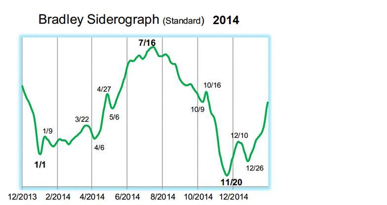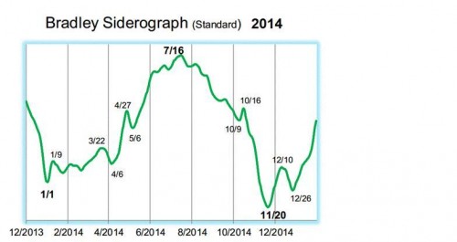 De beurzen staan aan de vooravond van een explosieve beweging. Dat blijkt uit de Bradley Model Siderograph meldt traderplanet.com. Dit model is door Donald Bradley ontwikkeld in de jaren 40 van de vorige eeuw om een voorspelling voor de aandelenmarkten te maken. Hij kende numerieke waarden toe aan bepaalde planetaire standen. De som is een de siderograph. De Bradley Sideropgraph is ontworpen om keerpunten in de Amerikaanse beursgraadmeter Dow Jones en de S&P 500 te voorspellen. Het voorziet niet of dat keerpunt een hogere top of lagere bodem wordt. Het model geeft slechts de sterkte van de trend aan door de daling of stijging op de Siderograph.