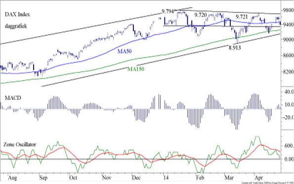 Van negatieve divergentie is geen sprake, maar er is aan de onderkant weinig ruimte om het ritme van stijgende bodems in stand te houden. De eerstvolgende steun zal gevonden worden op het MA150 en op de oplopende lange termijn trendlijn die daar vlak onder ligt. Ook de bodem die in maart bereikt werd (8.913) zal steun geven, maar gezien de positie van het MACD en de Zone Oscillator zou het ons niets verbazen als al deze steunpunten, al was het maar voor even, gebroken gaan worden. Langzaam maar zeker wordt duidelijk dat de hele correctieve beweging van een orde van grootte is die de lange termijn opgaande beweging aan het corrigeren is. Maar als dat het geval is, dan is hier geen sprake van een einde van een trend, maar van een adempauze die juist aan het begin staat van een nieuwe opgaande trend. Maar zover is het nog niet, want de korte termijn is, wederom, omlaag gericht.