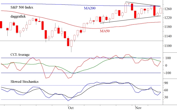 Het Volume moet met de trend meegaan, zo stelt de theorie en van dit meegaan is geen sprake. De Call/Put Ratio is in de laatste helft van de afgelopen week dramatisch gedaald in Amsterdam. Dat is een negatief teken. De AD/lijn lijkt neutraal, maar de New Highs en New Lows in Amerika hebben zich zeker nog niet hersteld. Al met al veel onzekerheid en dus is het geen tijd om voluit in de markt te zitten. Ter illustratie ziet u hieronder de daggrafiek van de S&P500.