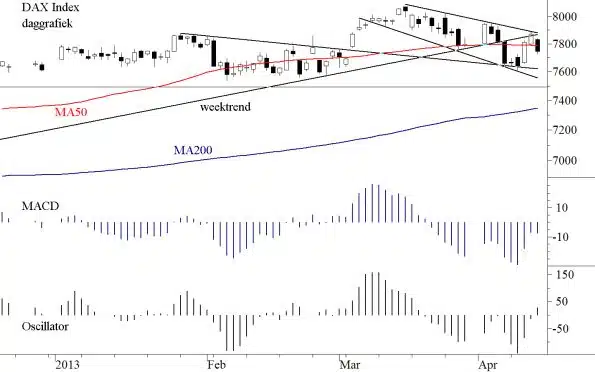 In figuur 1 hebben wij een daggrafiek van de DAX Index opgenomen. Al sinds medio maart van dit jaar is de koers van deze index in een dalend patroon heen en weer aan het fluctueren. Maar een time-frame hoger is te zien dat daarbij de voorgaande toppen en bodems, inclusief de meest recente bodem, voortdurend hoger zijn komen te liggen ten opzichte van elkaar. De verschillen zijn minimaal, maar de richting is duidelijk, er is nog steeds sprake van een stijgende trend. En ook het patroon in figuur 1 duidt op een voortzetting van deze trend. Een snelle opmars begin maart werd gevolgd door een veel langerdurende fase van minder snelle bewegingen tegen deze trend in. Het is het kenmerk van een correctiefase binnen een gezonde trend. En dus luidt onze conclusie: de meest waarschijnlijke richting van uitbraak uit dit kanaaltje is omhoog. Maar zoals dat in een statistische bezigheid, zoals de technische analyse nu eenmaal is, hoort: de uitbraak is pas een feit als de dagkoers tot boven het kanaaltje is uitgestegen. En tot die tijd luidt het adagium: geduld!