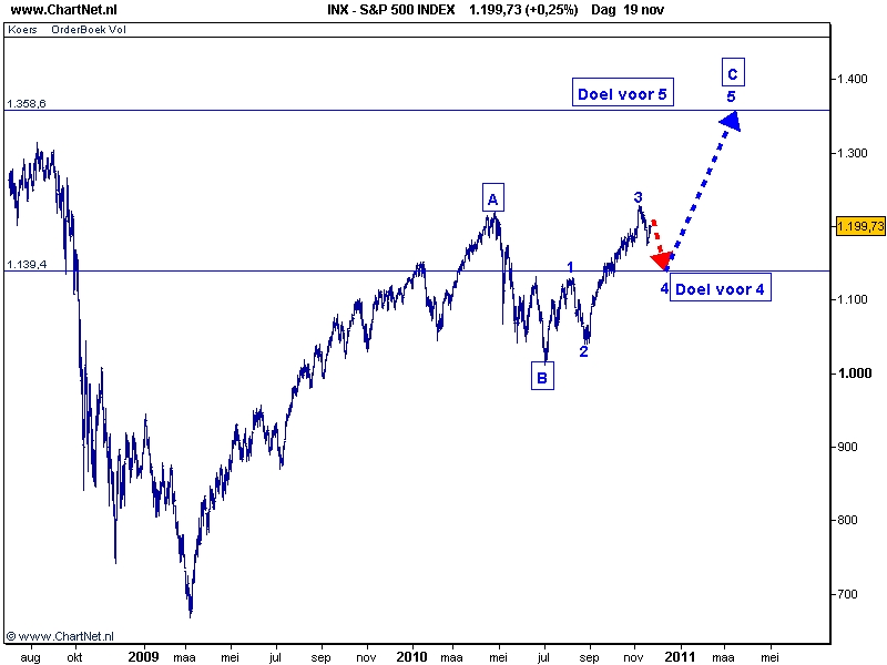 De Amerikaanse S&P 500 is bezig met een correctiefase. Deze correctie zal een deel van de koersen afsnoepen. Vorige week was het uitgangspunt dat deze index ongeveer 90 punten zou kunnen dalen vanaf de top. Waarom 90 punten dalen? Mijn uitgangspunt is dat we in de S&P bezig zijn met een correctie in golf 4. In veel gevallen is deze golf gelijk aan golf 2. Voor de S&P is op basis van deze veronderstelling een daling te verwachten tot ongeveer 1140. Na deze daling mogen we dus nog minimaal één stijging verwachten, golf 5. Hoewel dit prematuur is verwacht ik een stijging tot globaal 1350. Voor het idee heb ik op dit punt een C geplaatst. Deze golf C kan mogelijk de laatste stijging zijn sinds bodem van maart 2009 en kan een zeer belangrijke top gaan vormen.