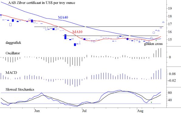 Vrijdag 9 augustus gaf de zeer korte Slowed Stochastics een koopsignaal. Mooi was dat, maar nog niets om over naar huis te schrijven. De maandag daaropvolgend brak de certificaatprijs door de barrière die opgeworpen werd door de voorgaande top. Weer een dag later kruisten het 10- en 40-daags voortschrijdend gemiddelde en werd er een golden cross neergezet. Het werd tijd om de eerste posities in te nemen. Vrijdag jongstleden werd een tweede barrière doorbroken en de weg ligt nu open naar boven. De Momentum Analyse volgt het prijsgebeuren maar komt binnenkort in een overbought positie. Een korte reactie is op zijn plaats, maar de weekgrafieken tonen nog veel ruimte zodat deze reactie ongetwijfeld zeer beperkt zal blijven. Zoals gezegd blijft het goud iets achter. De doorbraak door de tweede voorafgaande top heeft nog niet plaatsgevonden, maar voor de rest is het beeld hetzelfde. Als men vertrouwen heeft in de zilvergrafiek dan kan men ook een positie in het goud innemen.