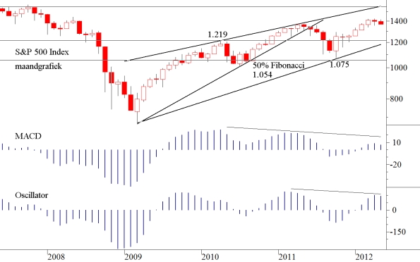 Wij laten u hieronder twee grafieken zien van de S&P500, achtereenvolgens de weekgrafiek en daarna de maandgrafiek.