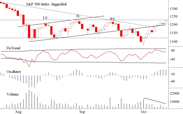 Dat er wel iets belangrijks gebeurd is moge blijken uit het feit dat de door ons eerder genoemde kopschouder-formatie in de S&P inmiddels tot het verleden behoort. Weliswaar werd dit patroon gecompleteerd met een legitieme uitbraak omlaag. Maar zoals dat zo nu en dan wel eens gebeurt, draaide de markt nog vóór het bereiken van het berekende doel, om vervolgens in sneltreinvaart tot boven de neklijn uit te stijgen.