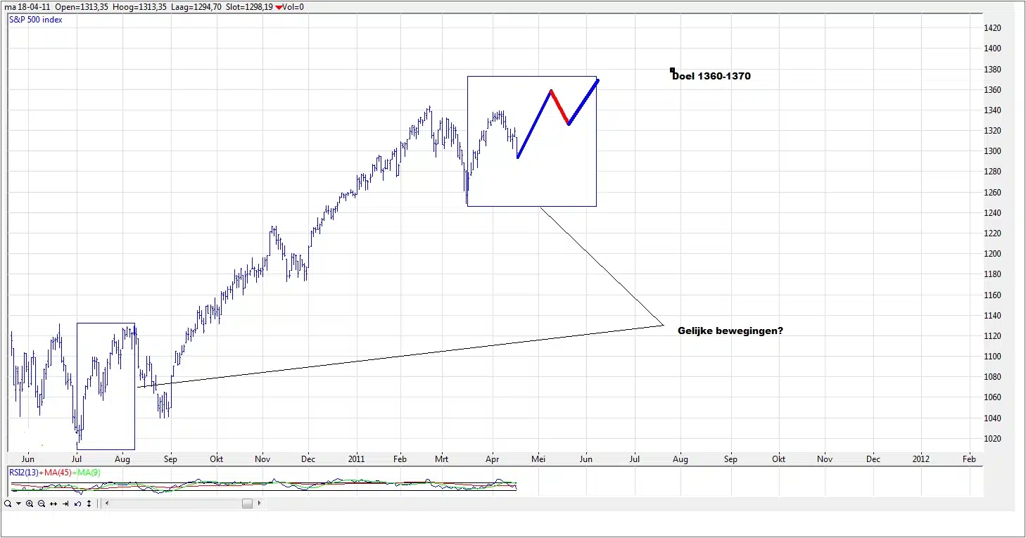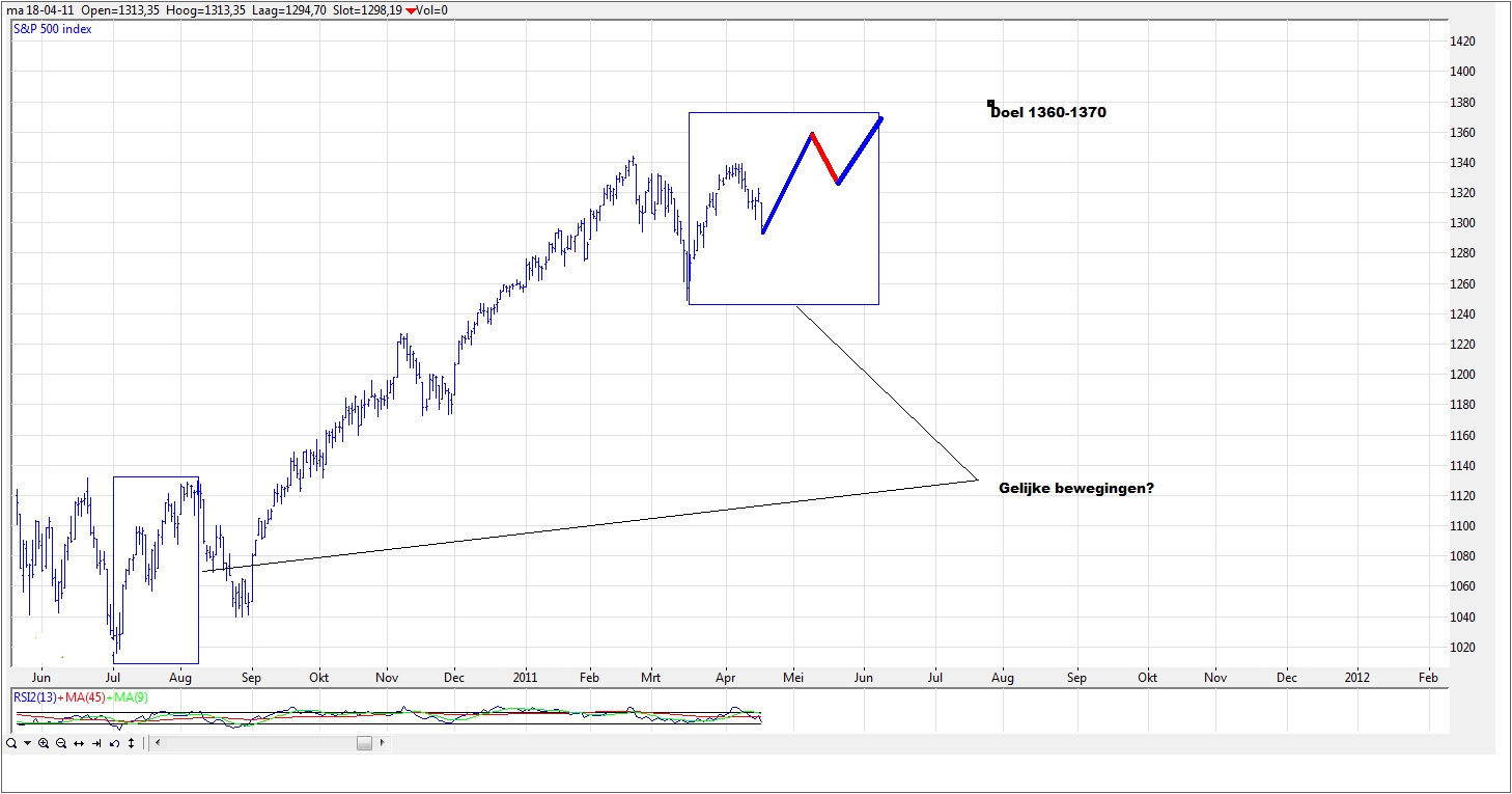 De S&P 500 heeft dan ongeveer 50% van de stijging gecorrigeerd en is aangekomen in het gebied rond 1300. Deze bewegingen, de stijging vanaf 16 maart en de daling vanaf 4 april, passen in het beeld van de stijging die we in juli 2010 hebben gezien. Daarnaast is er potentieel een omgekeerde kop schouder formatie in ontwikkeling. Dit patroon heeft een doel van 1430. Mooie vergezichten want dit patroon heeft slechts waarde indien de S&P boven 1340 weet te stijgen. We mogen dus concluderen dat, indien zich de parallellen doortrekken, een stijging tot uiteindelijk 1360-1370 mogelijk zou moeten zijn. Dus inhoudelijk gelijk aan de vorige berichten.