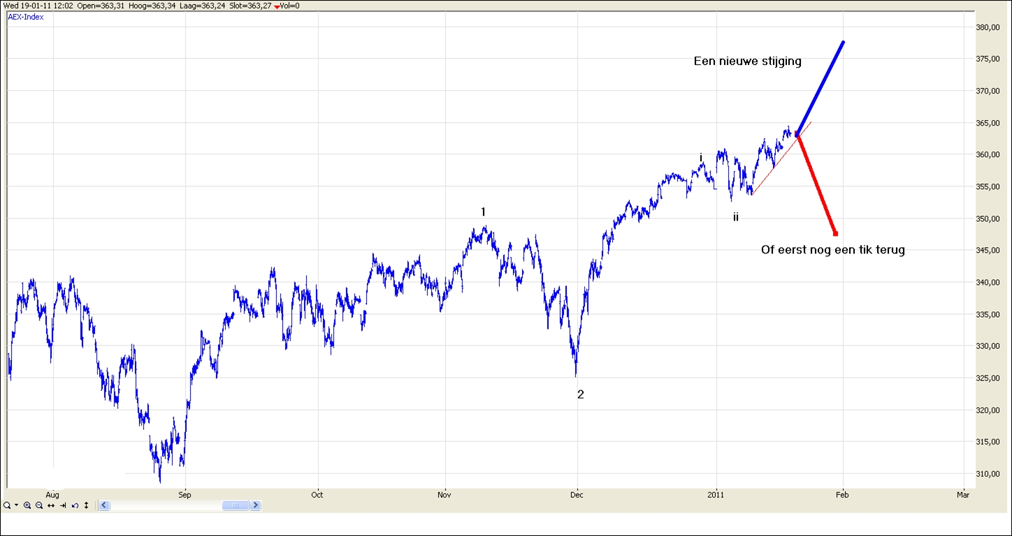 Met de AEX kun je alle kanten op. Vorige week leek de ingezette correctie nog een staart te kunnen krijgen. Door de opleving boven 364 lijkt dat op dit moment minder waarschijnlijk. Is de zwakte 362-352 dan al de correctie geweest en zitten we op dit moment in een nieuwe stijging of, en dat is ook mogelijk, is deze opleving nog een onderdeel van de correctie en gaan we eerst nog even een stuk naar beneden alvorens verder te stijgen? Indien we de komende dagen de opmars krachtig voortzet, dan moeten ervan uitgaan dat de sterkte van de afgelopen dagen de start is van een nieuwe beweging omhoog. De daling 362-352 moeten we dan als een volledige correctie zien. Hoewel deze wel erg klein is, zijn aan de minimale voorwaarden wel voldaan. In het geval we de komende dagen de stijging afbreken en onder 360 komen dan is een daling tot 347-343 nog mogelijk. Indien een terugval beperkt blijft tot 361,50 dan is een voortzetting van de stijging het meest waarschijnlijk.