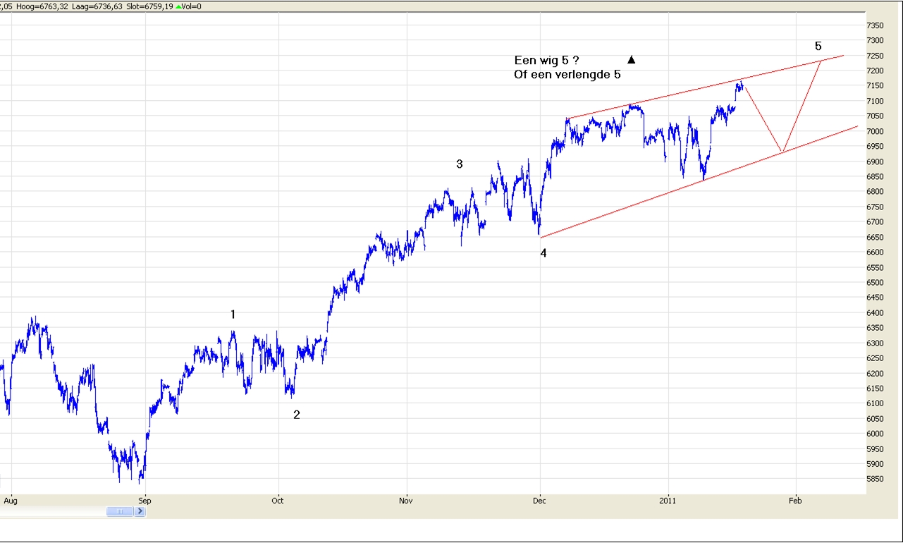Ook de Duitse DAX wist, na een correctie/ consolidatie van bijna een maand, gisteren nieuwe toppen neer te zetten. Omdat deze stijging naar het zich laat aanzien onderdeel is van een golf 5 is het op dit moment niet duidelijk hoe deze golf gestalte zal krijgen. Deze golf kan zich namelijk voltrekken in de vorm van een wig, in dat geval kan de uiteindelijke stijging beperkt blijven. In het andere geval dienen we rekening te houden met de mogelijkheid van een normale stijgingsstructuur. In dat geval bevinden we ons nu in een krachtige stijgingsfase. De komende dagen zal daarover wel meer duidelijkheid komen. Indien we te maken krijgen met een wig dan kan de DAX de komende dagen een daling inzetten tot ongeveer 7100-6980. In het andere geval zijn kleine correcties van 40 tot 50 punten voldoende om de stijging weer op te pakken.