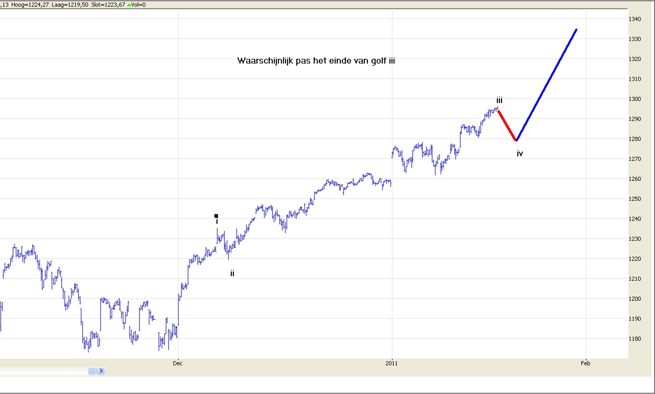 Na een rustdag op maandag kan de stijging van gisteren een topje voor de S&P inhouden. De verhoudingen en de indicatoren geven aan dat we waarschijnlijk met het einde van golf 3 te maken hebben. In dat geval zou, na een kleine correctie van een punt of 20, de opmars voortgezet kunnen worden. Deze opleving zou de S&P 500 dan mogelijk richting 1350 kunnen sturen. Dit punt is het volgende belangrijke aandachtsgebied omdat we rond 1350 het 76,4% herstelpunt tegen komen. Tevens is daar de huidige stijging 61,8% over de stijging van maart 2009 tot april 2010.