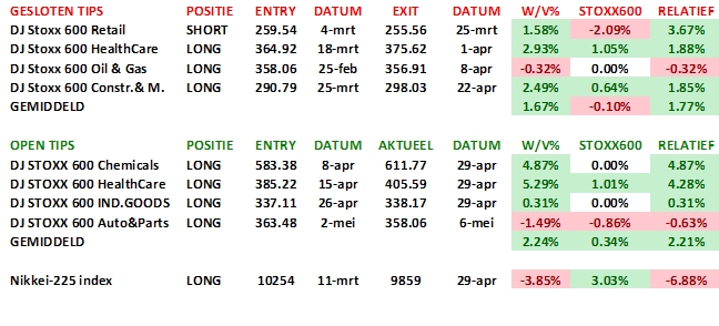 Abusievelijk werd de Nikkei-225 in het overzicht van vrijdag niet vermeld. De Nikkei-225 index is de enige TIP die niet op basis van het relatieve sterkte concept is opgenomen, maar wordt aangehouden op basis van de aanname dat de geschiedenis in het koersverloop van de Nikkei-225 index in 2005 zich in 2011 zal herhalen.