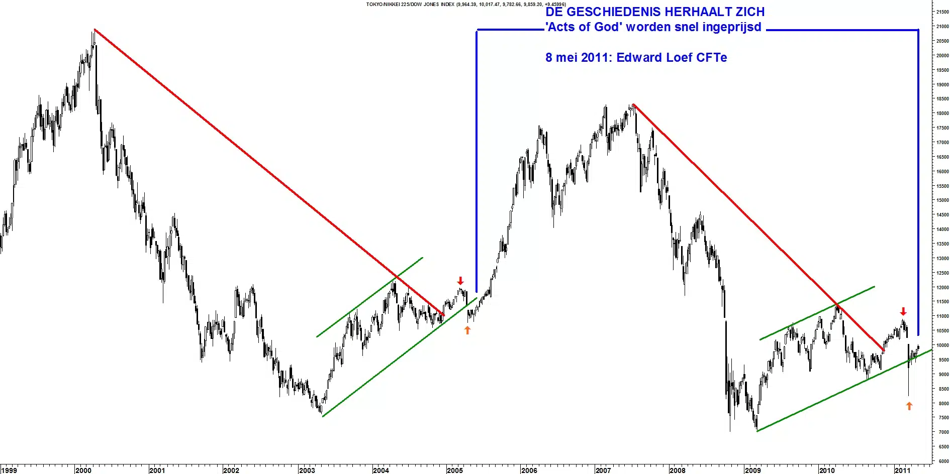 Abusievelijk werd de Nikkei-225 in het overzicht van vrijdag niet vermeld. De Nikkei-225 index is de enige TIP die niet op basis van het relatieve sterkte concept is opgenomen, maar wordt aangehouden op basis van de aanname dat de geschiedenis in het koersverloop van de Nikkei-225 index in 2005 zich in 2011 zal herhalen.