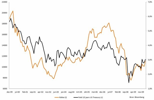 Interessant is in dit verband onderstaande grafiek waarin een sterke correlatie tussen de Nikkei Index en het rendement op Amerikaanse 10-jaars staatsobligaties te zien is. Treasury yields reflecteren in zekere mate de groeivooruitzichten van de Amerikaanse economie. Wanneer bedrijven weer herstellen van de crisis, zal de vraag naar leningen toenemen, dat weer een opdrijvend effect heeft op rentes en yields.
