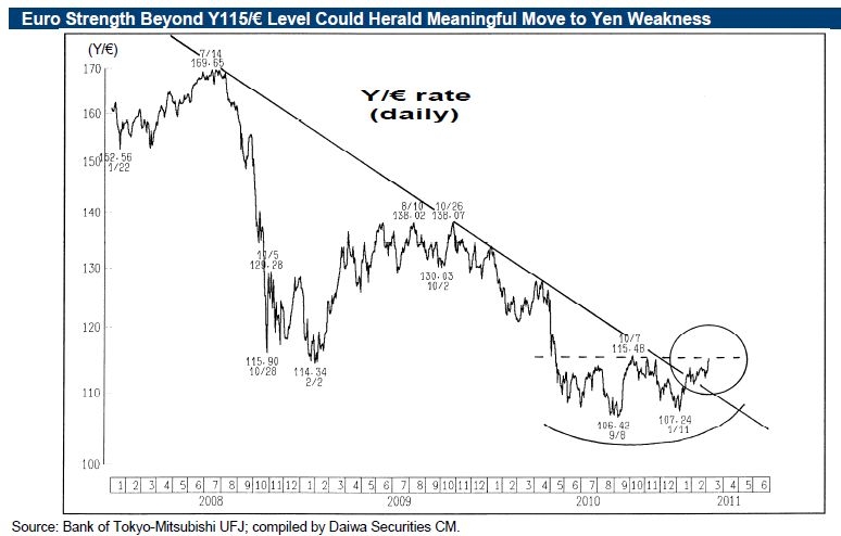 Grafiektechnisch lijkt de yen verder te gaan verzwakken ten opzichte van de euro, met het doorbreken van de dalende weerstandslijn (zie grafiek). Gisteren schoot de euro omhoog versus de yen, nadat de voorzitter van de Europese Centrale Bank, Trichet, zinspeelde op een renteverhoging van 25 bps bij de volgende meeting op 7 april. Deze stap komt onverwacht, want de marktverwachting was dat de ECB pas op zijn vroegst na de zomer met de eerste renteverhoging zou komen. Een verzwakking van de yen komt Japanse exporteurs die zich op Europa richten goed uit. Deze ontwikkeling, gecombineerd met goede cijfers ten aanzien van de Amerikaanse werkgelegenheid zorgden ervoor dat de Nikkei index met 1,02% steeg vandaag. Op weekbasis steeg de graadmeter met 1,6%, maar door de verzwakking van de yen daalde de Nikkei-index deze week met 0,86% gemeten in euro’s. De intrinsieke waarde van de Japanse Warrants steeg deze week met 2,4%.