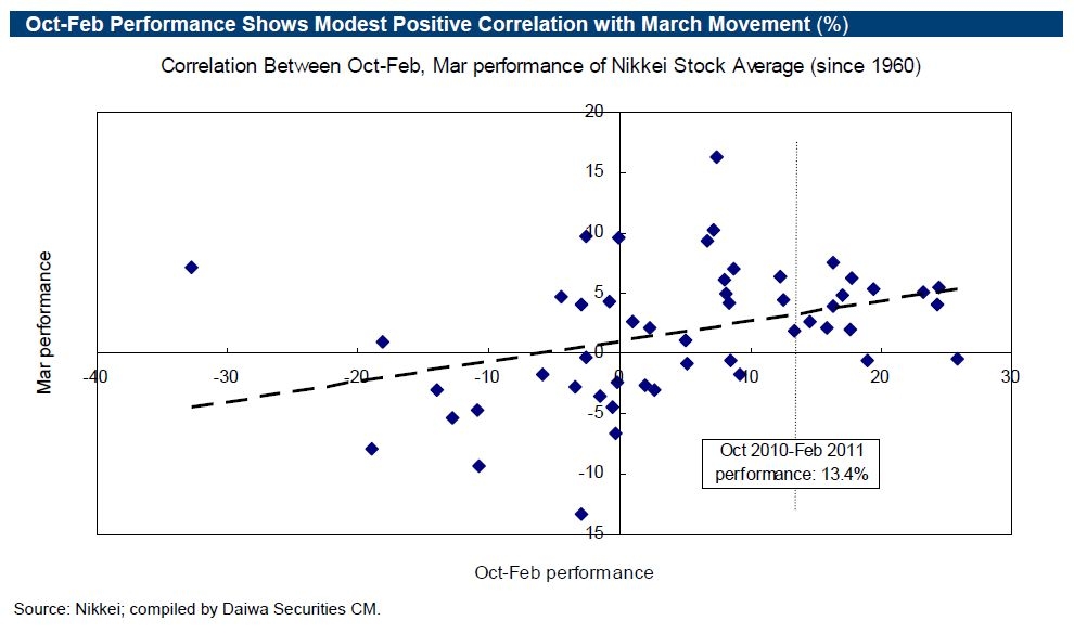 In de periode van oktober 2010 tot en met februari 2011 heeft de Nikkei een rally laten zien van 13,39%. De Japanse Warrants stegen in dezelfde periode met 43,7%. Maart is de laatste maand van het fiscale boekjaar en de analisten van Daiwa Research vroegen zich af of er deze maand nog kans is op verdere koersstijging. Om deze vraag te beantwoorden maakten zij een analyse, waarin de correlatie wordt bepaald tussen het rendement van de Nikkei index in maart en de voorafgaande periode (okt-feb) sinds 1960. Deze correlatie blijkt licht positief te zijn (zie grafiek).