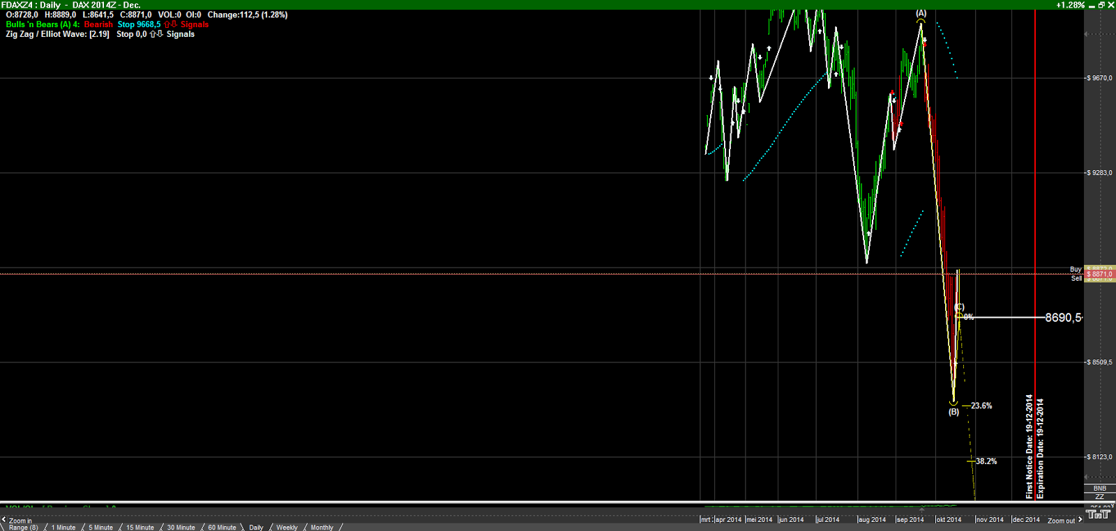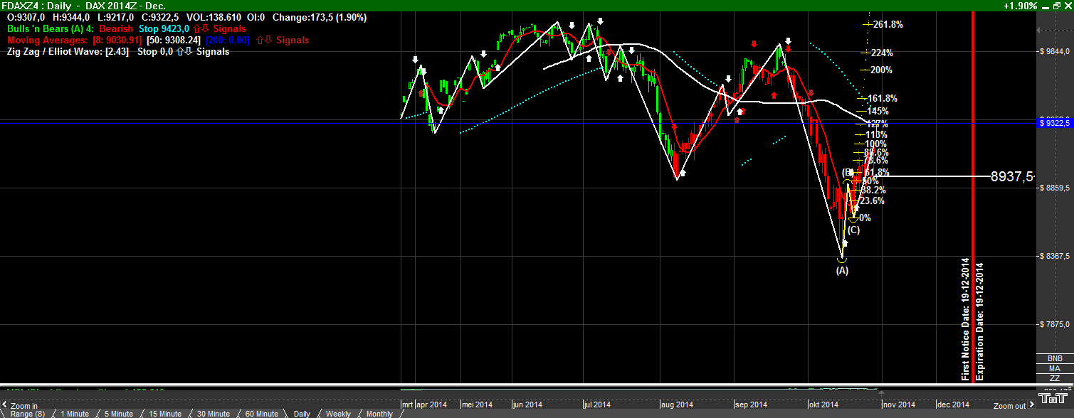Plaatje van de Dax future,http://2.bp.blogspot.com/-occ8w0sDAMI/VEJF0cOaO8I/AAAAAAAAAFg/ClZzZ5ywXfM/s1600/FDAXZ4%2B-%2BDAX%2B2014Z%2B-.png De Wave labeling heb ik weg gelaten daar je deze voor jezelf in kunt vullen. Ik geloof dat je je ‘Wave 4 up’ even naar beneden moet bijstellen, als het überhaupt wel een Wave 4 is ..