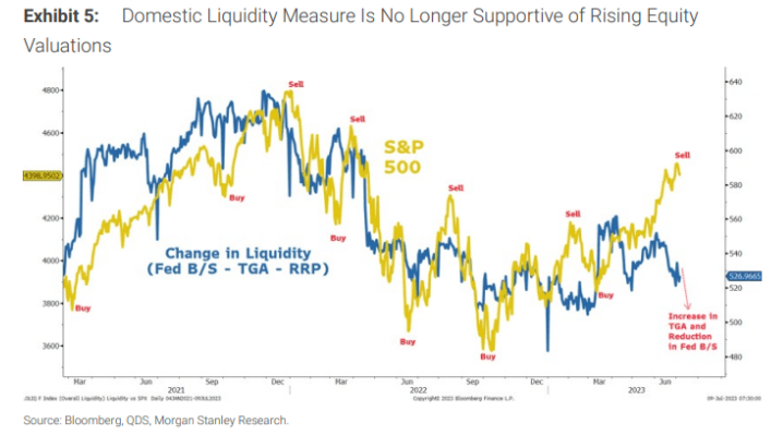 Morgan Stanley heeft een verkoopsignaal afgegeven dat nog nooit zo duidelijk is geweest. De hoofdstrateeg van deze bank denkt dat de aandelenmarkt overgewaardeerd is en dat er een correctie aan zit te komen. Hij baseert zich op een indicator die de relatie tussen de liquiditeit en de index laat zien.