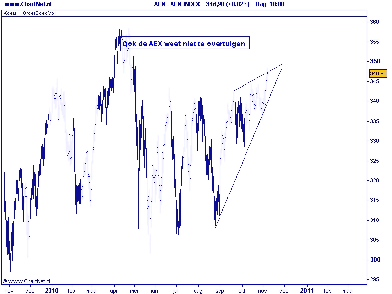 De Franse CAC 40 en de AEX zijn duidelijke achterblijvers in de recente stijging. Dit is was voor mij reden om de positieve verwachtingen van twee weken geleden wat te temperen. Belangrijk daarbij was dat er in deze marken een patroon in ontwikkeling is, die veel kenmerken heeft van een wig. Omdat een dergelijk patroon nogal negatieve gevolgen kan hebben, is een zekere terughoudendheid in deze indices nog op zijn plaats. Op dit moment zitten we aan de bovenkant van het patroon. Een daling onder 337 – 335 in de AEX zie ik als een neerwaartse uitbraak en kan een aanzienlijke correctie veroorzaken. Bij deze zone ligt dan ook mijn stop loss.