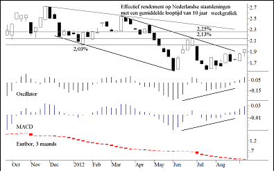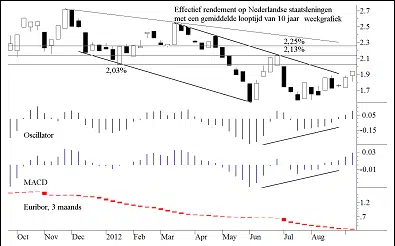 In juli van dit jaar werd er een hogere bodem gezet binnen een dalend kanaal. Vorige week is de rente aan de bovenzijde uit dit kanaal gebroken en hij is op weg naar de dalende trendlijn, die nu uitkomt op ongeveer 2,25% De Momentum Analyse daaronder is stijgende en divergeert positief. Het technische beeld wijst dus inderdaad op een verdere stijging maar men moet zich afvragen of de zojuist aangekondigde QE3 niet een (voorlopige?) rem zal zetten op een verdere stijging. Zoals altijd het geval is in de technische analyse wachten wij op een confirmatie van de uitbraak.