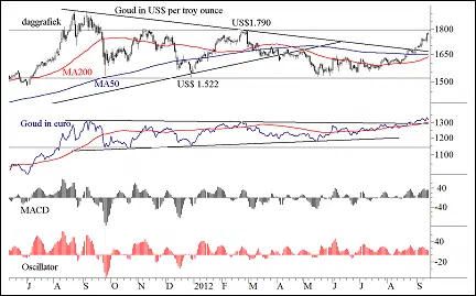 Sinds november 2011 bevindt de prijs van een troy ounce goud zich in een horizontaal kanaal tussen US$1.522 en US$1.790 (zie figuur 2). Enkele weken geleden werd de barrière van de dalende trendlijn genomen en sindsdien ligt de weg naar de bovenkant open. Alles wijst erop dat hij daar wel zal komen maar de vraag staat open of hij uit zal uitbreken. Wij zullen tenminste rekening moeten houden met een korte rustpauze. De grafiek laat duidelijk zien dat er kracht in markt zit. QE3 zal positief uitwerken op de goudprijs. Voor Europese beleggers is het beeld echter minder attractief want zij dienen rekening te houden met een negatieve toekomst voor de dollar. Maar uit de grafiek blijkt dat de stijging van de goudprijs ook in Euro’s tot een doorbraak geleid heeft, dus ook voor Europese beleggers is het goud koopwaardig.