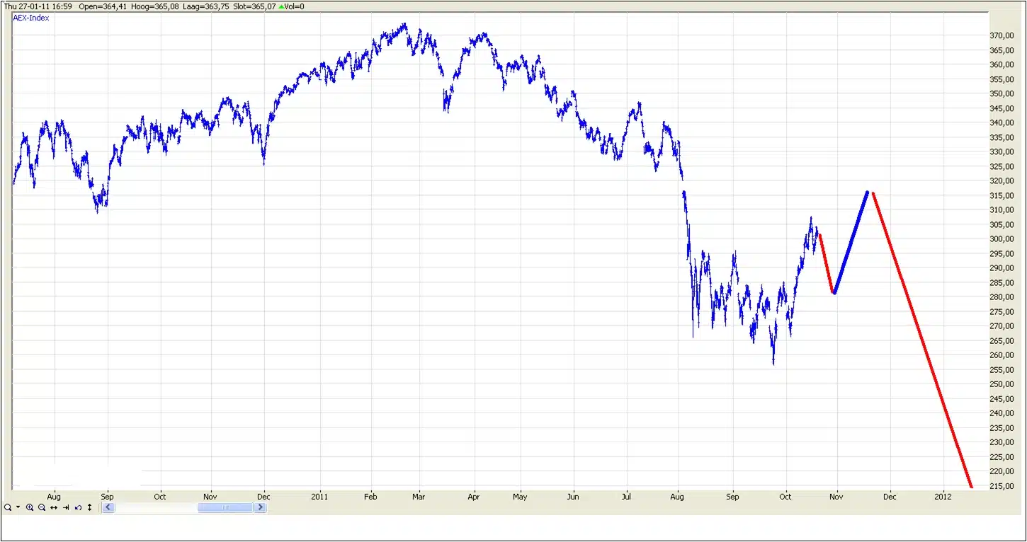 Waarschijnlijk gaan we eerst een daling zien tot ongeveer 280 en vervolgens nog een stijging tot 320-330. Vervolgens is mijn visie weer dalend. Deze daling zou de AEX kunnen voeren tot onder de 200 punten.