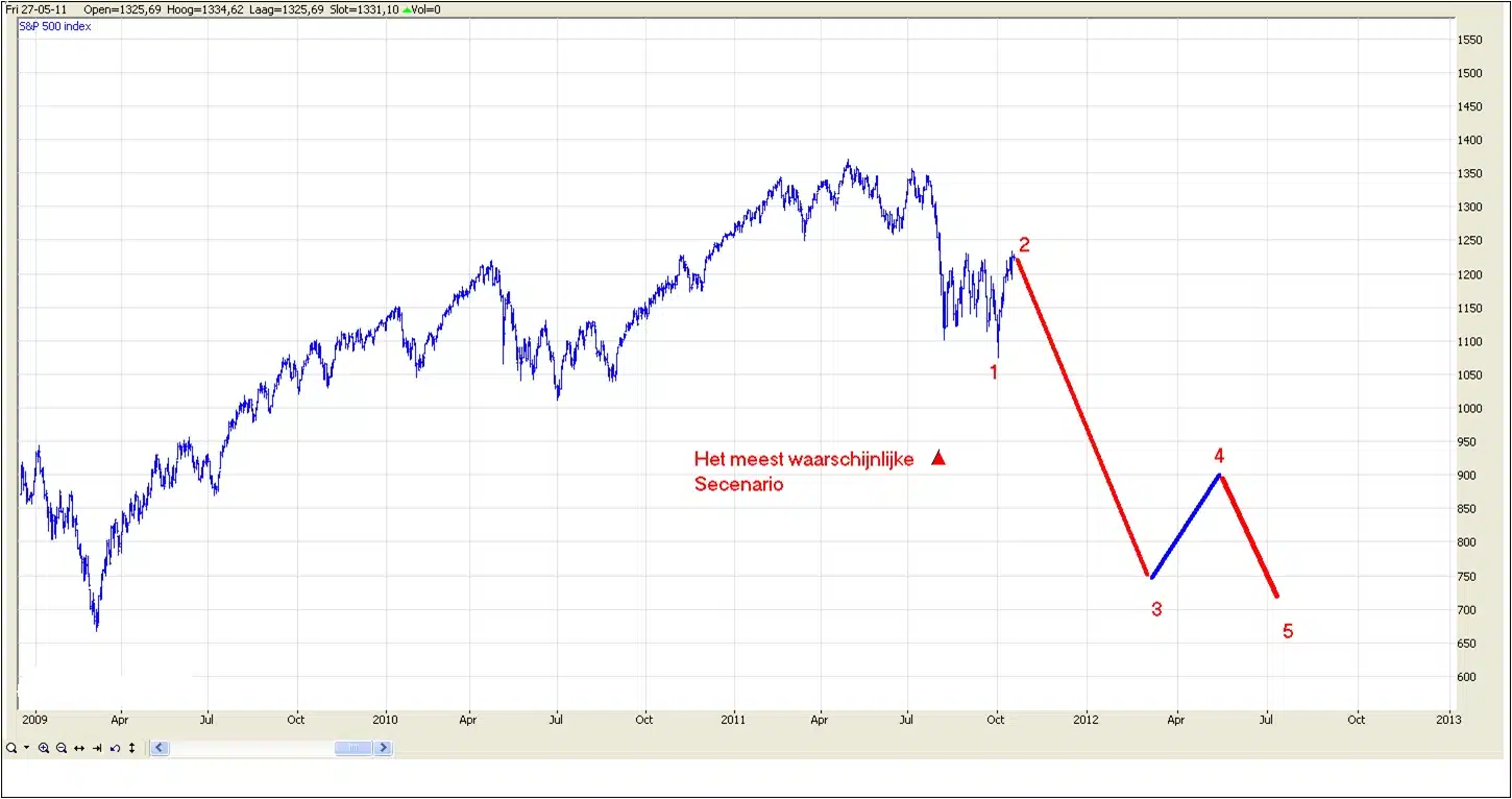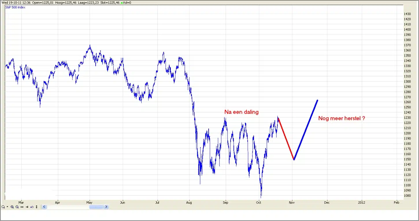 De stijging vanaf 4 oktober lijkt vrijwel compleet, een correctie over deze stijging de komende dagen lijkt dan ook aannemelijk, ik ga hierbij uit van een daling tot het gebied 1170 – 1150. Indien de S&P hier steun gaat vinden dan is vervolgens een stijging tot ongeveer 1255-1260 mogelijk. Dit zou sterk overeenkomen met de daling en het herstel welke we in 2007 hebben gezien. Als twee druppels water lijkt de daling van dit jaar op de aanvang van de daling  2007-2009. Niet dat het altijd werkt maar zeker iets om in gedachten te houden.