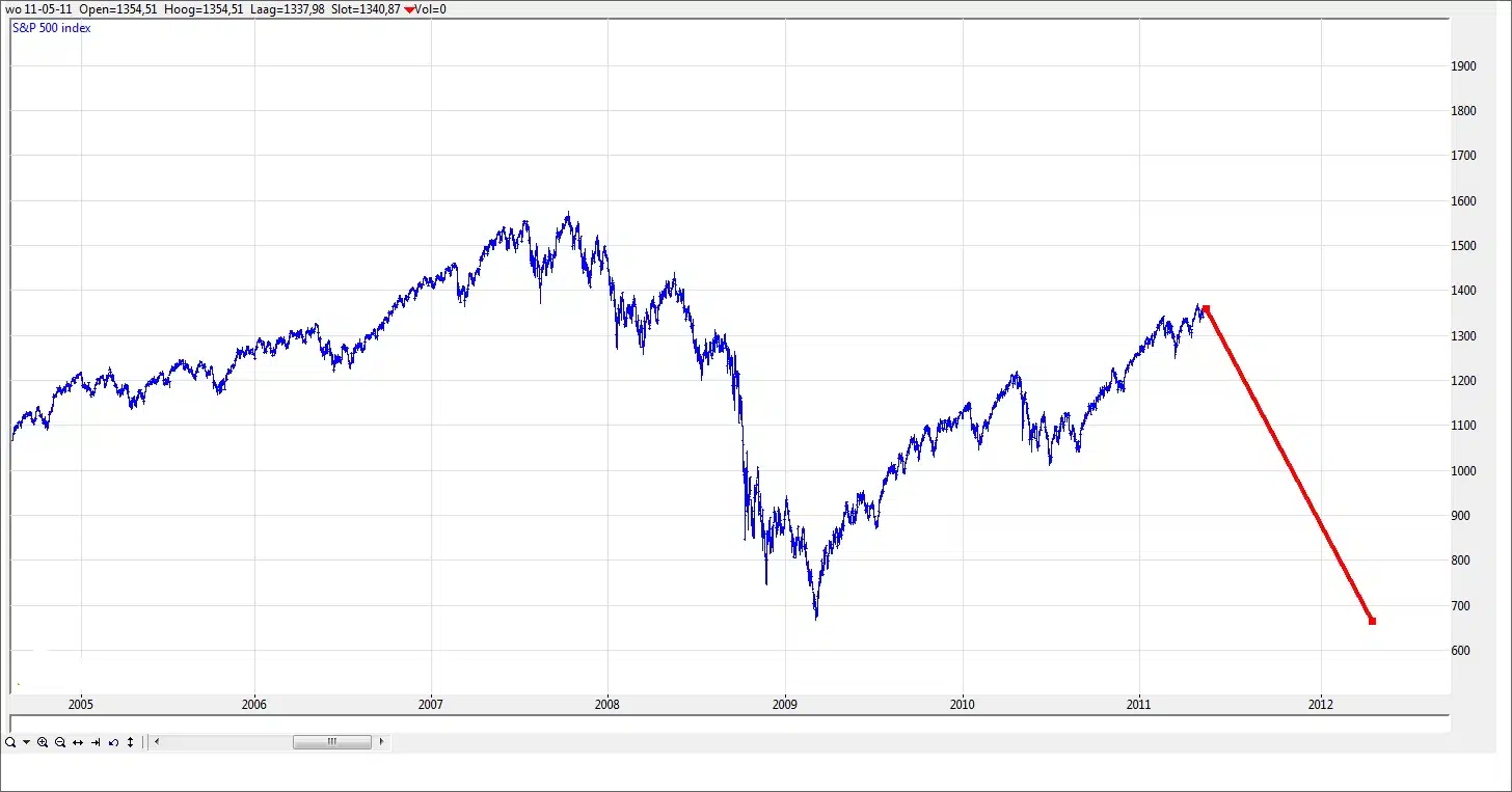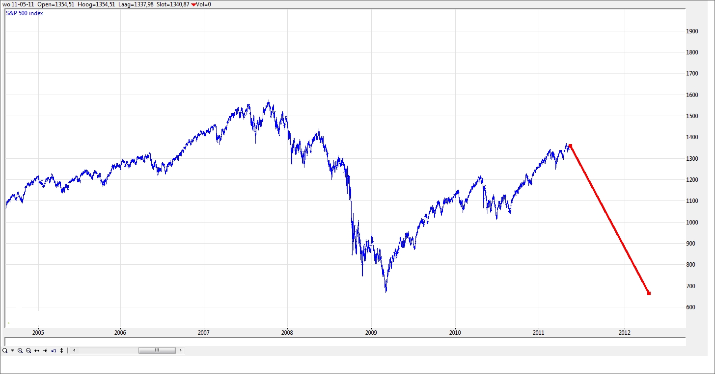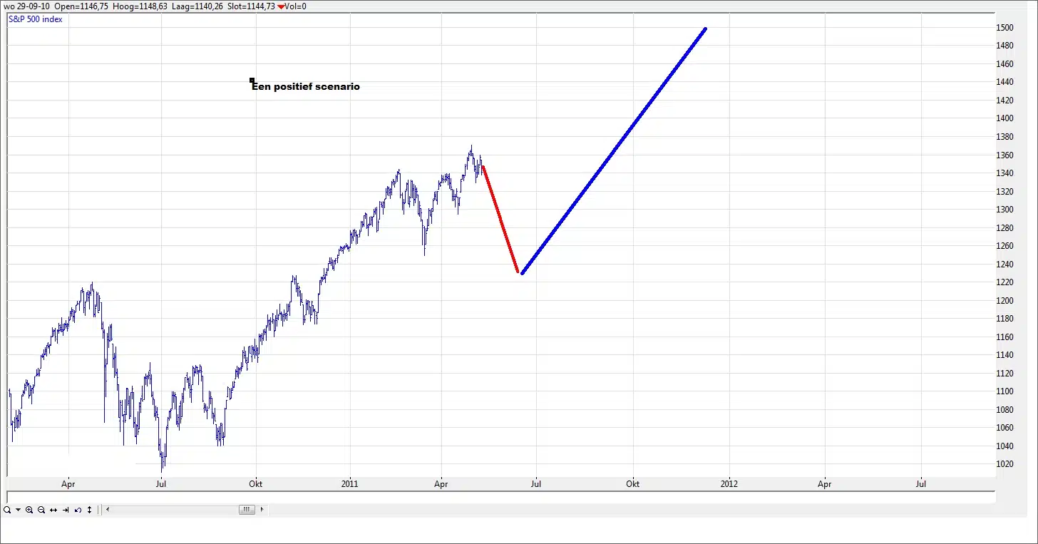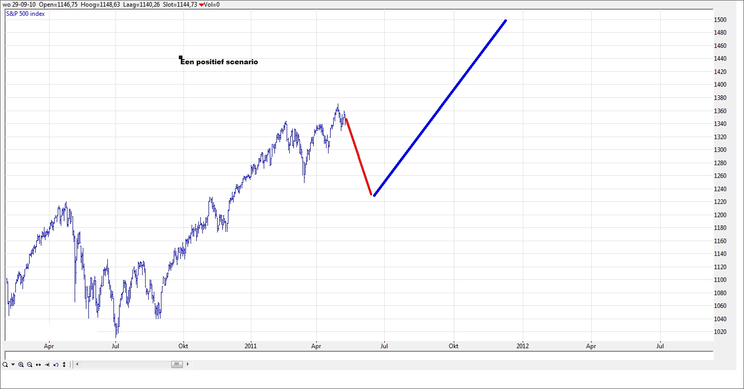Omdat we zelfs in een positief scenario in de S&P een daling tot 1230 of mogelijk 1190 mogen verwachten is het alleen om reden van deze correctie handig om wat gas terug te nemen. In het negatieve scenario is een daling mogelijk die in de buurt van de maart 2009 bodem komt.