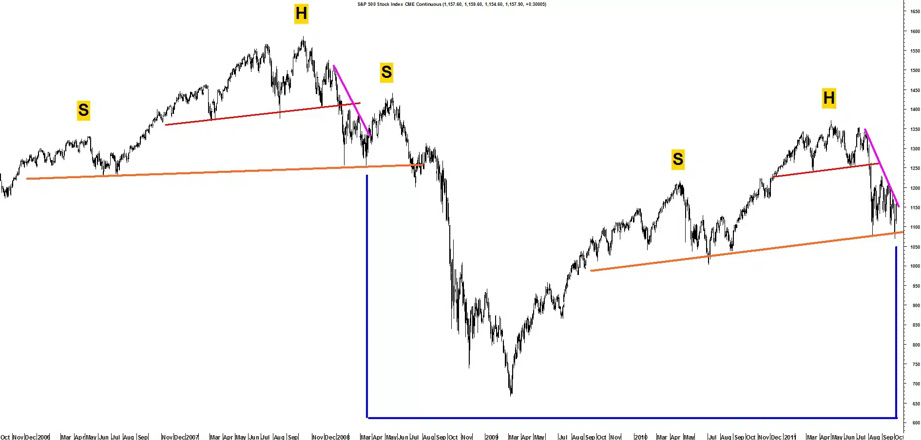 In de technische analyse is het niet ongebruikelijk dat de geschiedenis zich neigt te herhalen. Het kuddegedrag op de financiële markten laat duidelijk herkenbare voetsporen achter waar men lessen uit kan trekken. Zo tekende zich tijdens het topvormingsproces in 2007 het beruchte hoofdschouder-patroon af, gevolgd door een breuk van de neklijn in januari 2008.