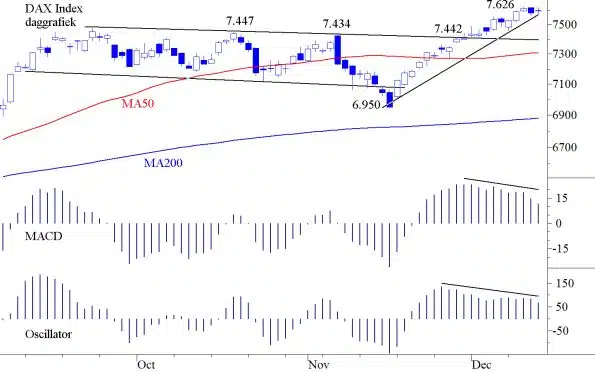 In het algemene beeld is deze week niets veranderd met dien verstande dat de aanstaande correctie zich duidelijker manifesteert. In Amerika is hij al ingezet. In Europa zal hij een dezer dagen volgen. Wij laten u hieronder de daggrafiek van de DAX zien. Sinds medio november is de DAX van 6.950 met ruim 9,7% gestegen naar 7.626. Een prachtig resultaat maar daar gaat nu de klad in komen. U kunt een Bearish Engulfing herkennen, met daaropvolgend een Harami in de vorm van een Doji. Tezamen vormen zij een Harami Cross.