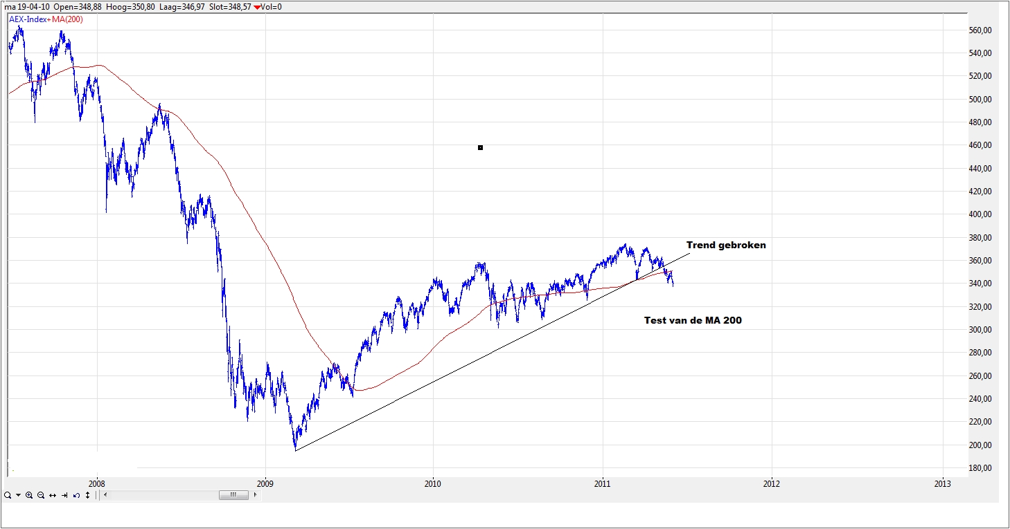 De zwakte van de AEX gedurende de afgelopen maanden ten opzichte van andere indices heeft tot gevolg gehad dat de trend sinds maart 2009 reeds is doorbroken. Tevens is het 200 daags voortschrijdende gemiddelde neerwaarts doorbroken en terug getest, het signaal dat er dus voor de middellange termijn druk op de koersen verwacht mag worden. Is de AEX een voorloper?