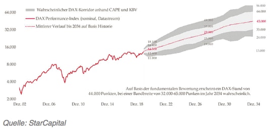 Hij gaat er daarom van uit dat de DAX in 2033 met 40.000 punten zal fluctueren en zijn multi-geadresseerde koersdoel van 27.000 punten in 2028 zou moeten halen. Met een waarschijnlijkheid van 90% zal de Duitse beursindex dan niet onder de 11.000 punten komen. De kansen zijn dus veel groter dan de risico’s.