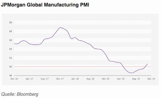 Laten we niettemin eens kijken naar de economische ontwikkeling . De indices van inkoopmanagers (PMI) worden beschouwd als een van de meest betrouwbare voorlopende indicatoren. De wereldwijde PMI voor de maakindustrie heeft zich de afgelopen maanden weer boven de 50% uit de contractiefase gewerkt. Een licht herstel van de industriële economie in 2020 zou zeer positief zijn voor de ontwikkeling van de aandelenmarkt. Hij is hier niet zo zeker van. De handelsoorlog tussen de vorige hegemonische macht VS en de Chinese uitdager kon ons, ondanks mogelijke gedeeltelijke overeenkomsten, meerdere jaren vergezellen. Als de wereldeconomie hierdoor in een recessie terechtkomt, kan dit wel eens tijdelijke schokgolven op de markten veroorzaken.