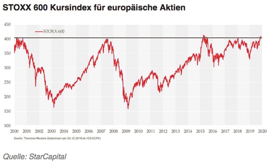 Het waarderingsaspect is niet onbelangrijk voor het verloop van de beurs . Hier voeren we vaak aan dat aandelen aanzienlijk worden overgewaardeerd na een opwaartse fase van tien jaar. Dit kan op sommige gebieden van toepassing zijn – vooral voor ‘aandelen van defensieve kwaliteit’, die nu prominent vertegenwoordigd zijn op bijna elke effectenrekening. Maar over het algemeen kan daar geen sprake van zijn. Europese aandelen bevinden zich bijvoorbeeld nog steeds in het begin van 2000, hoewel de bedrijfswinsten de afgelopen twintig jaar aanzienlijk zijn gestegen. Er zijn dus veel zeer goedkope aandelen, vooral in het waardegebied. En in vergelijking met de beleggingsalternatieven kan er, gezien de historisch lage rentetarieven, geen sprake zijn van overwaardering.